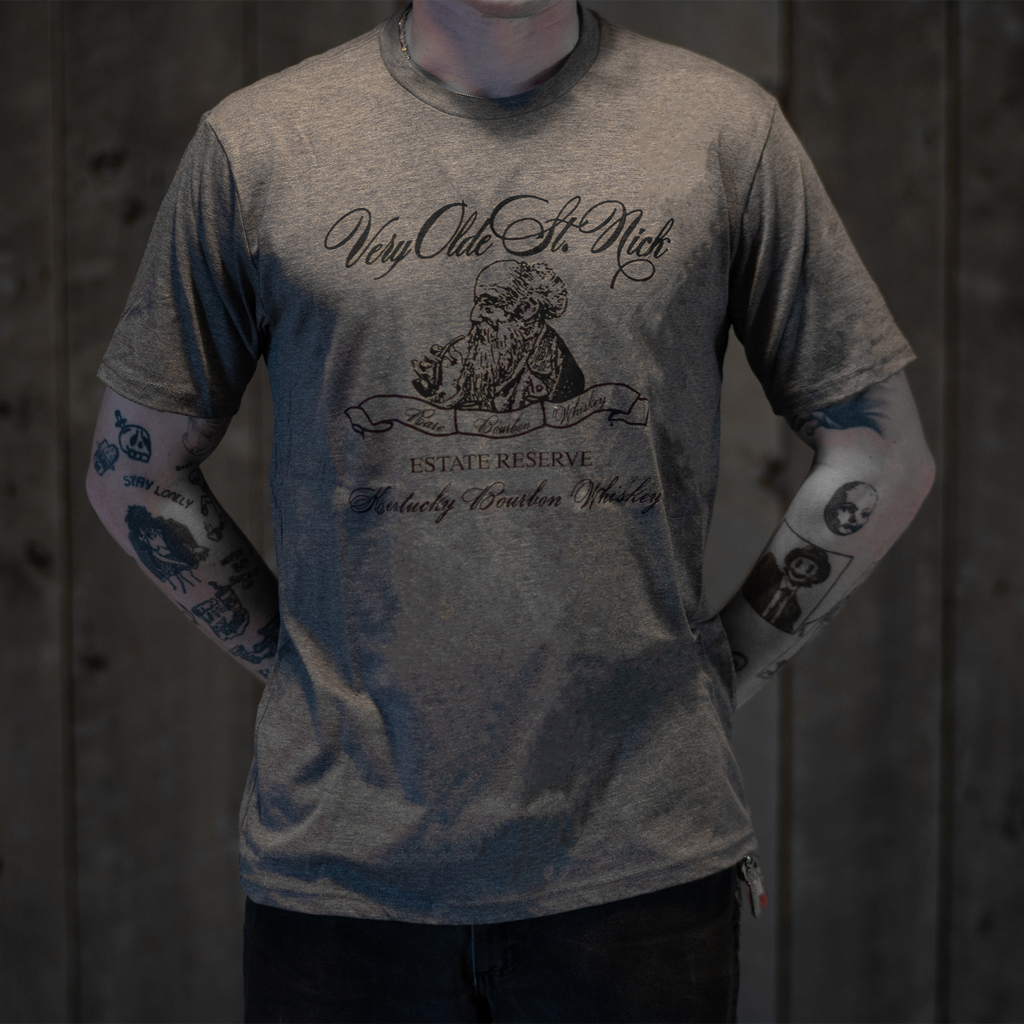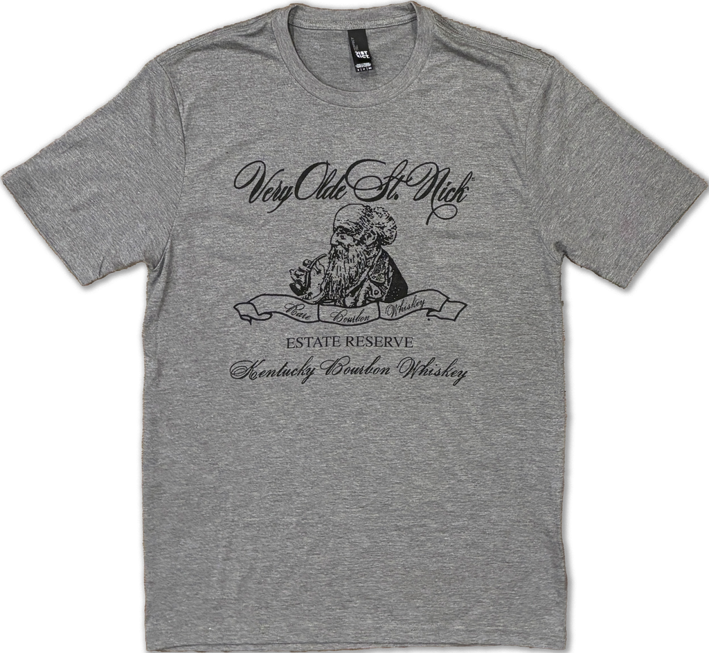 Celebrate bourbon history with the Very Olde St. Nick T-Shirt. This 4.5 oz. poly/cotton/rayon blend features a 1x1 rib knit neck and tear-away label, making it a comfortable must-have for collectors and enthusiasts.